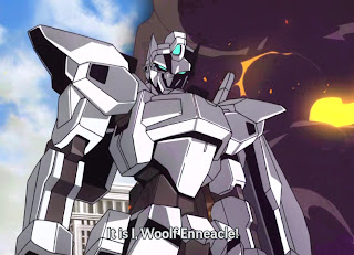 But the spotlight gets stolen a little bit from the Titus as our boy Wuulf Enneacle shows up in his brand new suit, the G-Exes. It’s a pretty awesome scene as he proceeds to charge into battle and whilst fighting lists the reasons why his mobile suit is so great. After dealing a fatal blow to a Baqto he confidently states the best reason the G-Exes is so good is because, “I, Wuulf Enneacle, am its pilot.” Okay Bandai, we get it, we’ll go out and by an HG G-Exes… not. :p :)